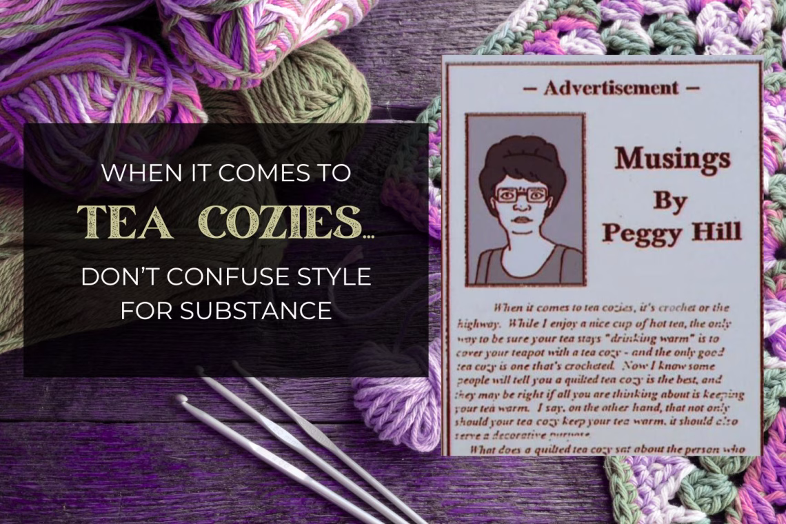 “When it comes to tea cozies, it’s either crochet, or the highway.” If you’re not familiar with Musings by Peggy Hill (from the show King of the Hill), Peggy writes a column for the local paper. Included are hundreds of her classic musings, such as: Although there is no “L”…